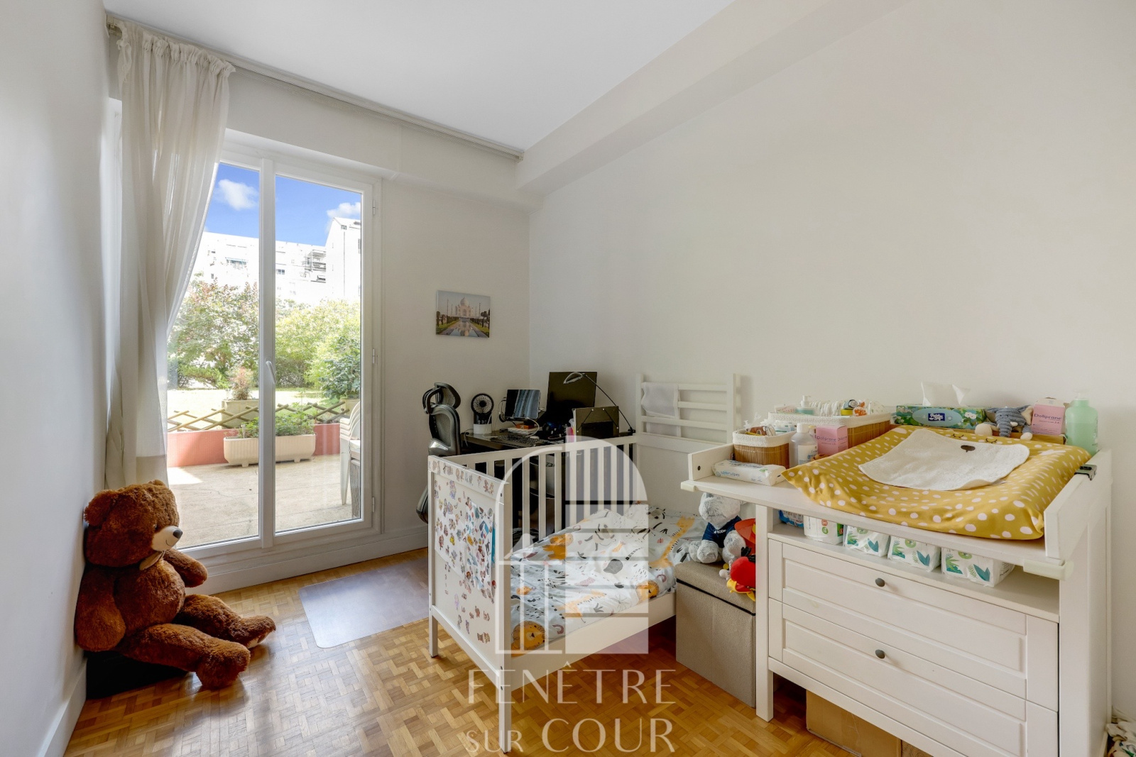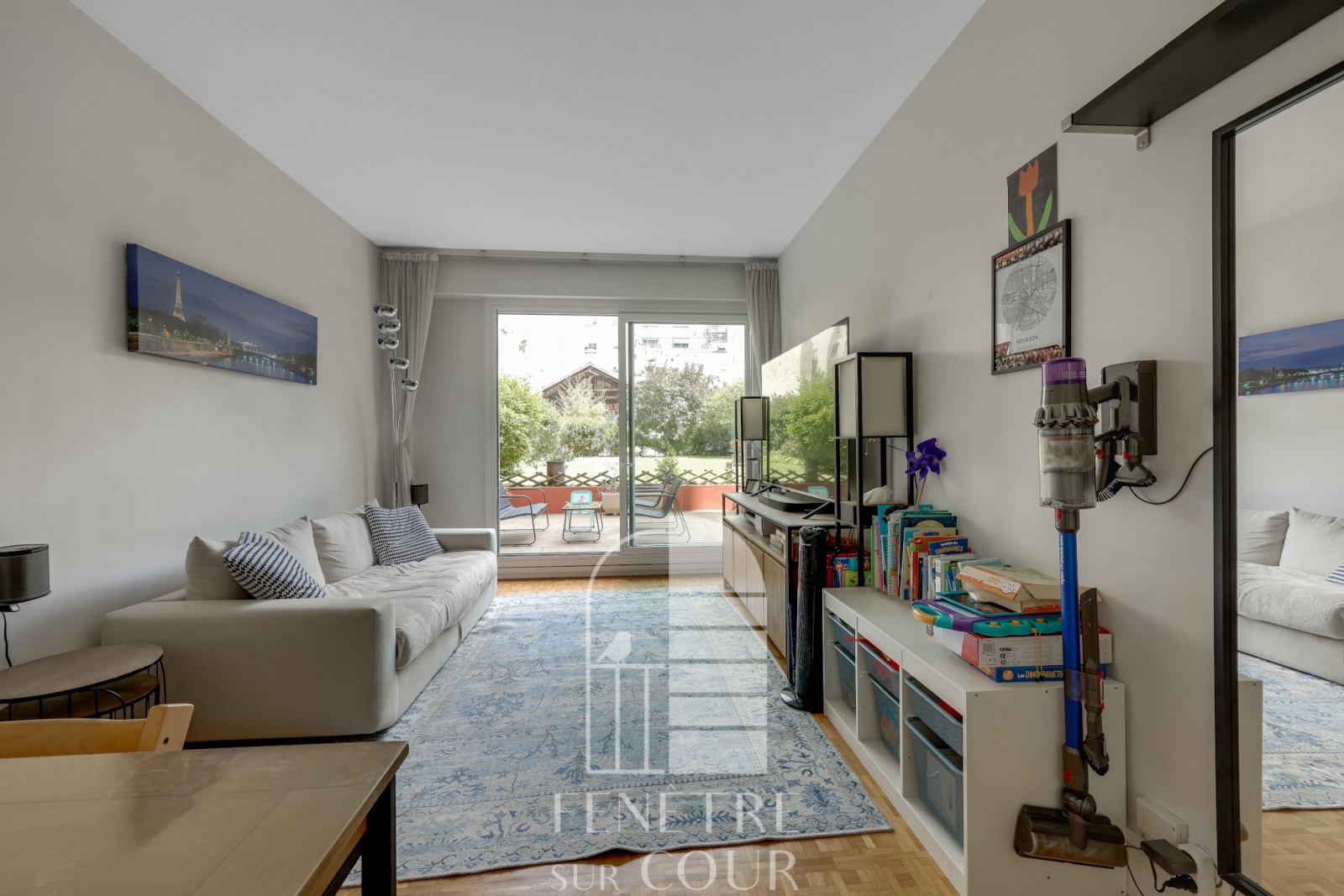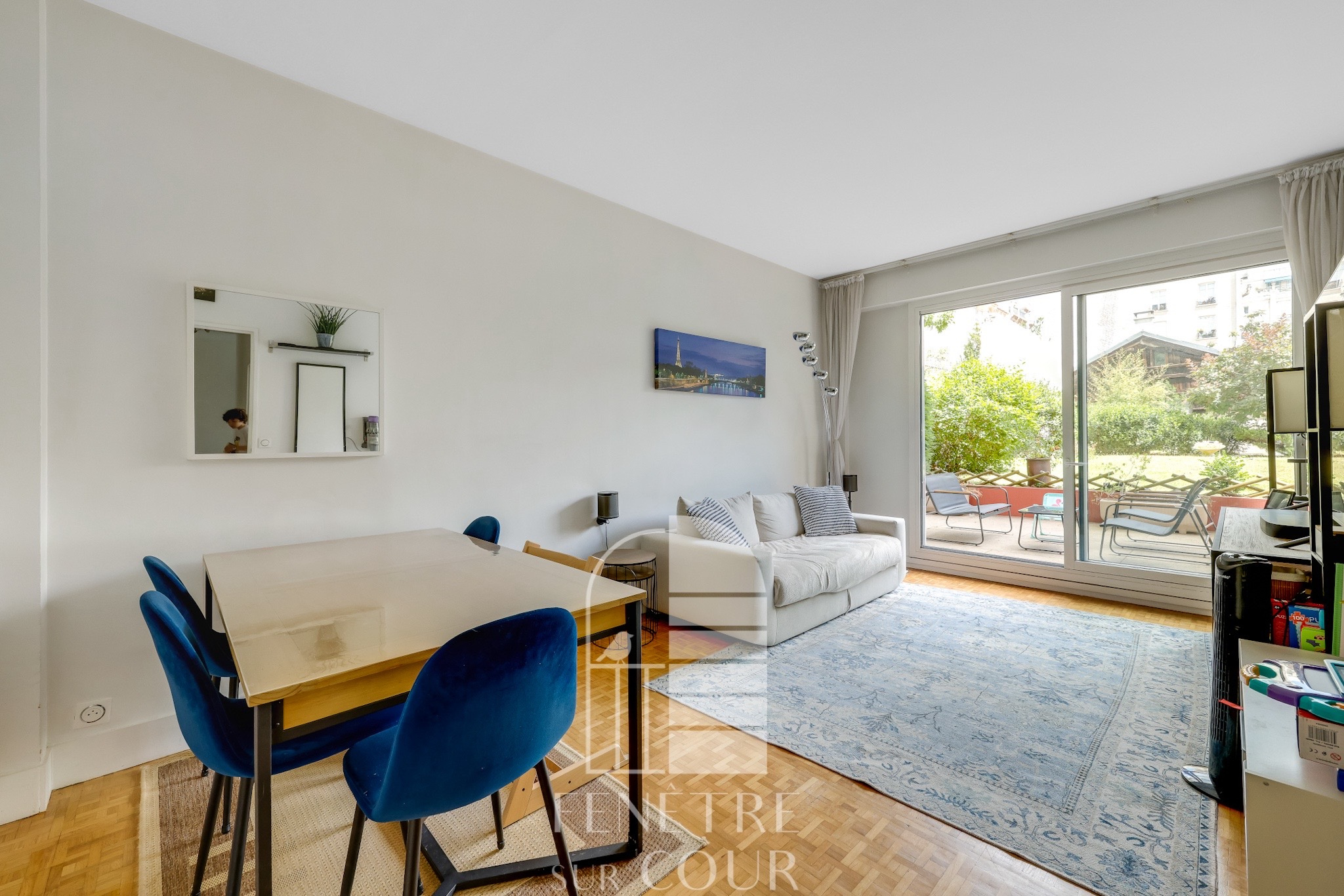 Un 3 pièces (2 chambres) de 70m2, absolument impeccable, distribué en étoile, et ouvrant sur une grande TERRASSE de 40m2, sur un JARDIN de 370m2.