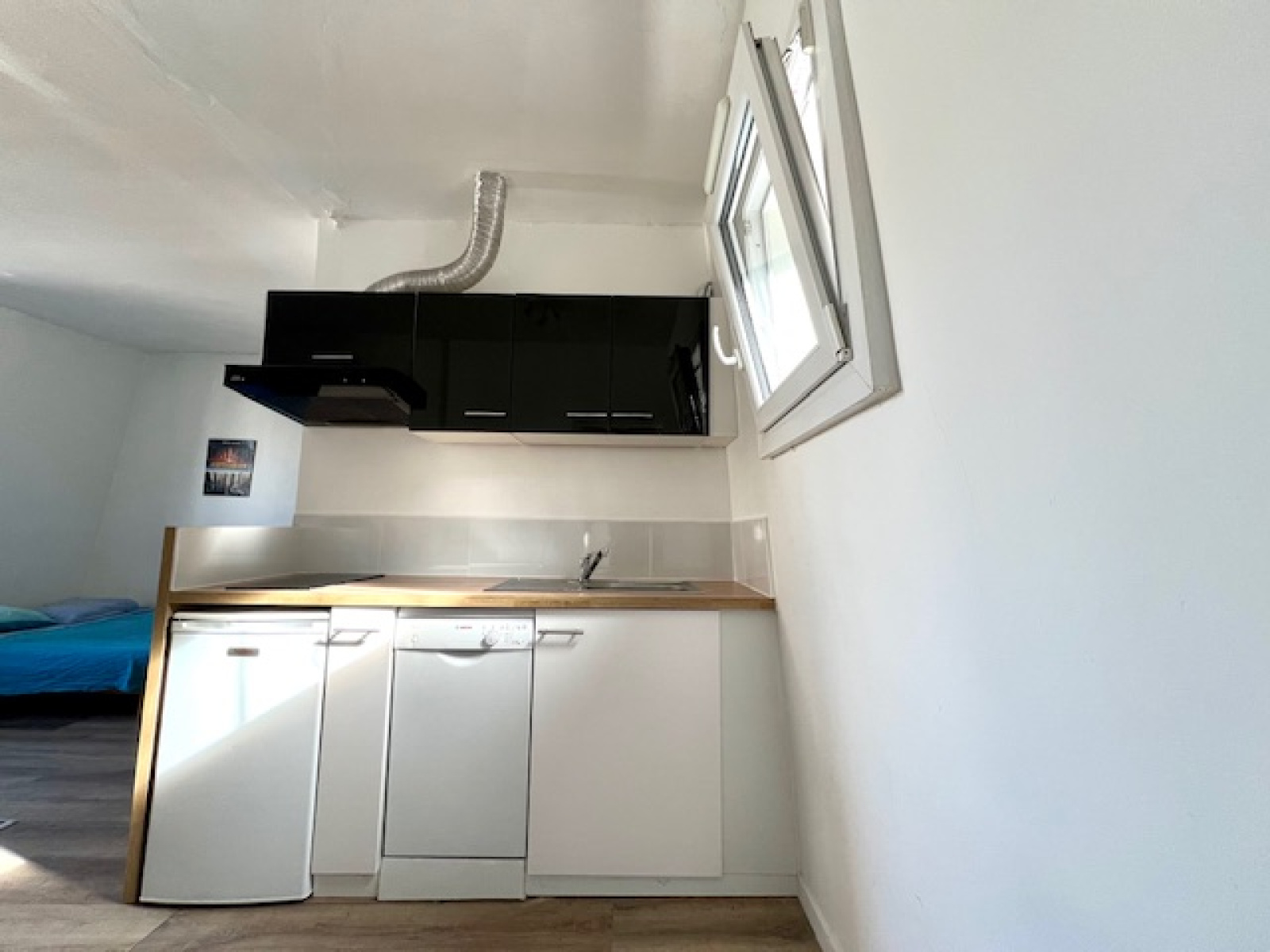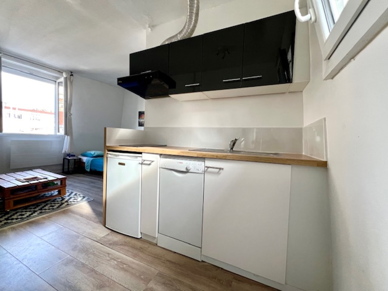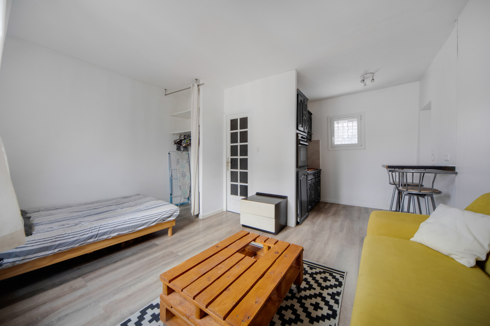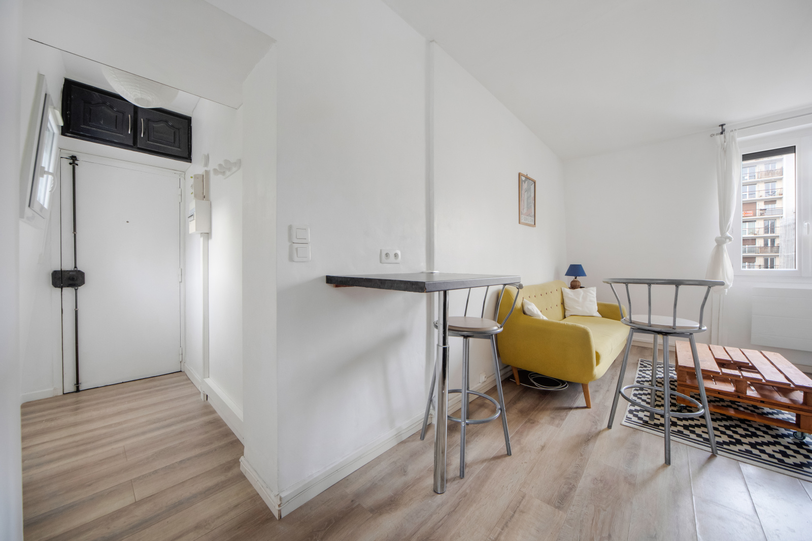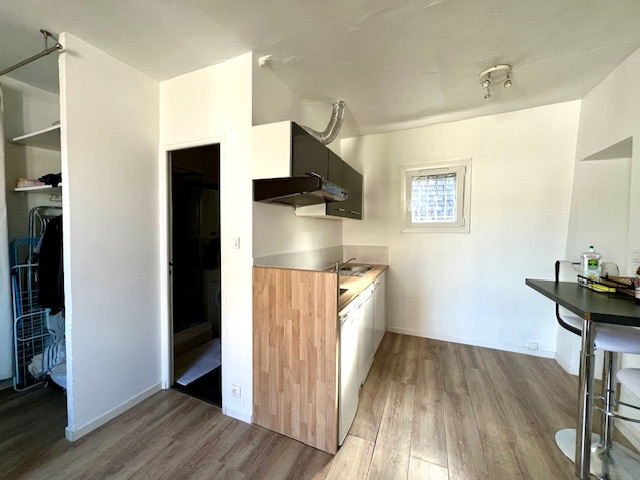 Studio, au plan idéal, aucune perte de place, dans l'ancien, situé au 4e et dernier étage, sans ascenseur, à deux minutes du métro !