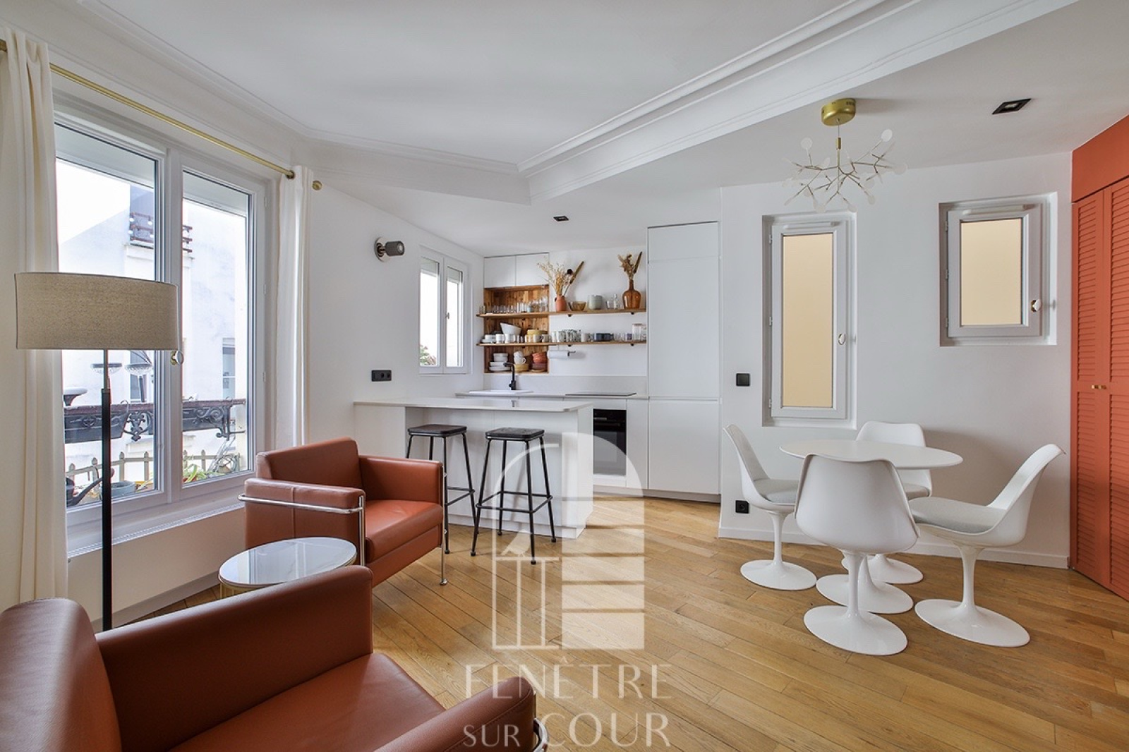 Au 5ème étage : grande pièce salle à manger / cuisine, une chambre avec dressing, au 6ème étage : salon / bureau, une chambre avec rangements, salle d'eau avec wc.