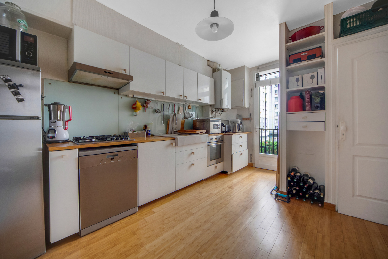 Paris (75019)Situé dans un agréable immeuble en Pierre de Taille impeccable, voici un appartement familial composé d'une entrée, d'un double séjour de 30m2, d'une grande chambre avec un bureau attenant, d'une vaste cuisine dînatoire, d'une salle de bains et d'un wc séparé. Possibilité de créer une deuxième chambre supplémentaire facilement.
